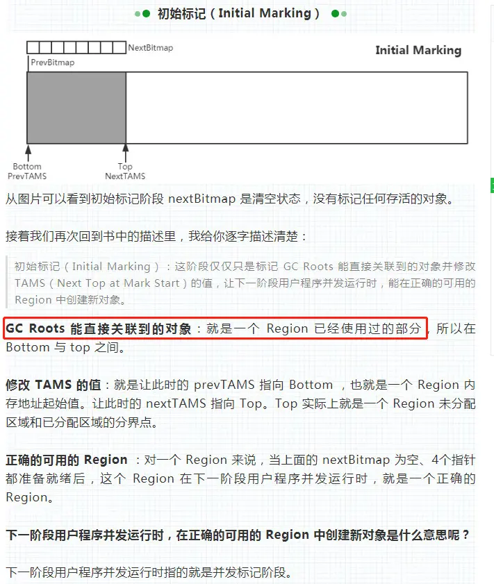 通过文章中后半部分的这个图片也可以直观的发现, bottom 到 top 之间是一个 Region 已经使用的部分。但是这一部分中,只有 bottom 到 NextTAMS 之间的对象才是 GC Roots 能直接关联到的对象,这部分对象并不是一个 Region 已经使用过的部分。