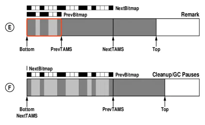 前面刚刚说了,这个 Region 由于“价值”不够,它逃过了上次垃圾回收,所以待到下次垃圾回收的时候,就是 prevBitmap 的用武之地了,它里面记录的地址对应的区间就不需要再次标记了,因为这些地址对应的对象就已经是垃圾了。