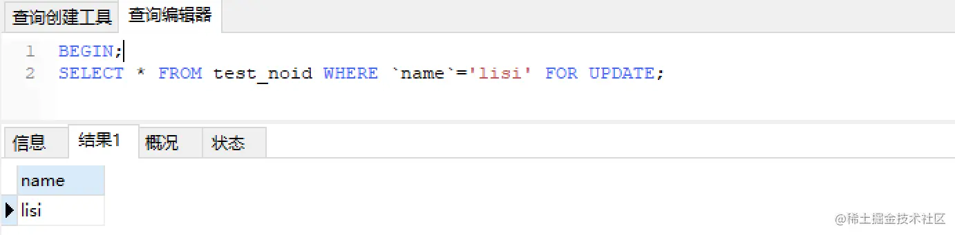 SELECT * FROM test_noid WHERE `name`='lisi' FOR UPDATE;