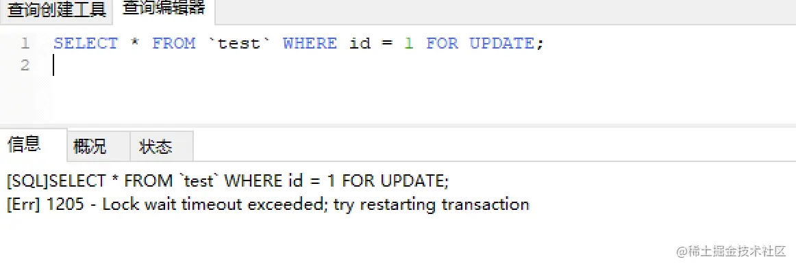 SELECT * FROM `test` WHERE id = 1 FOR UPDATE; -- 加排他锁