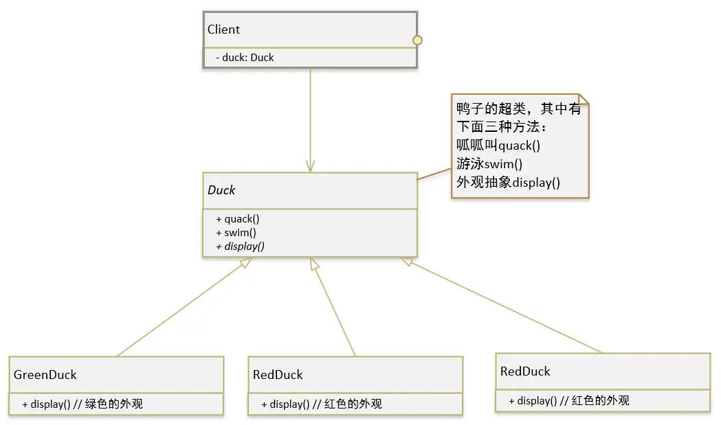 比如有一个鸭子的游戏,应用中有许多种鸭子(黄鸭子、绿鸭子),玩家(Client)可以操作游戏中的任何一个鸭子。因此我们可以定义一个鸭子的超类(Duck),所有的鸭子继承这个超类,玩家只需要引用Duck这个超类即可操作所有的鸭子,这似乎是个不错的设计,其类图如下: