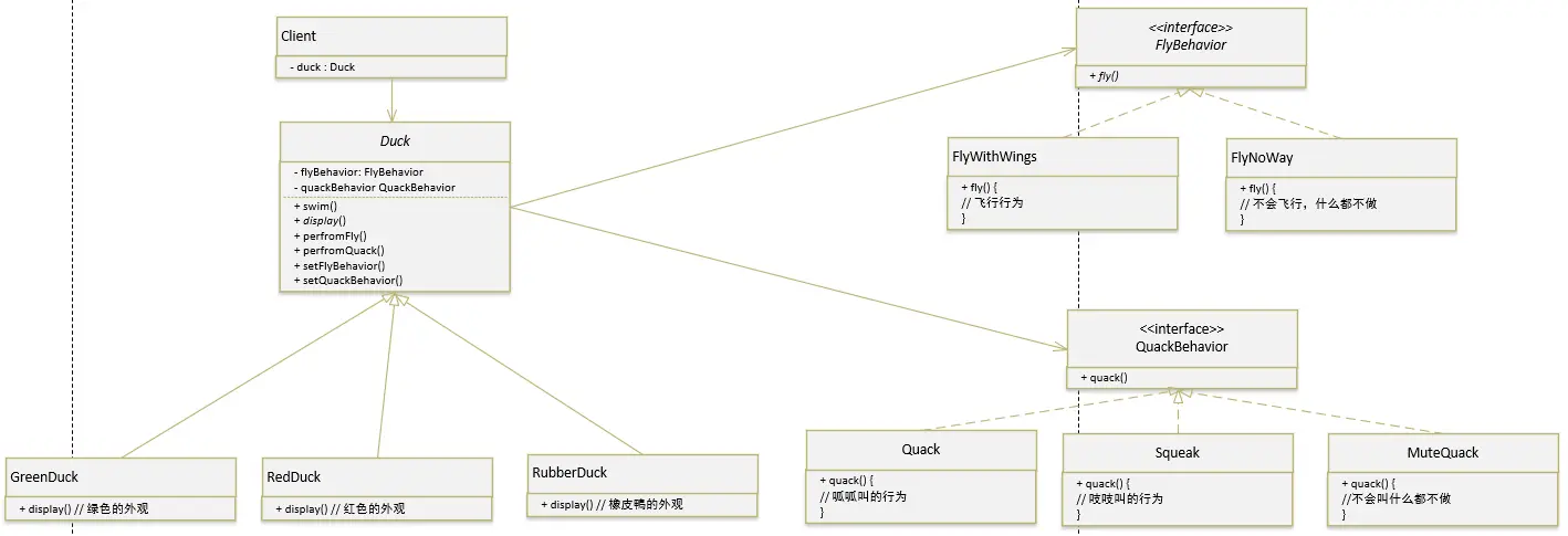 通过这样的设计,Client可以适配所有Duck的子类,并且想往游戏中新增一个蓝色的鸭子易如反掌,Duck已经实现了游泳和呱呱叫的方法,我们的蓝色鸭子只需要继承Duck并实现蓝色的外观(dispaly抽象方法)。这是不是完美的设计呢?