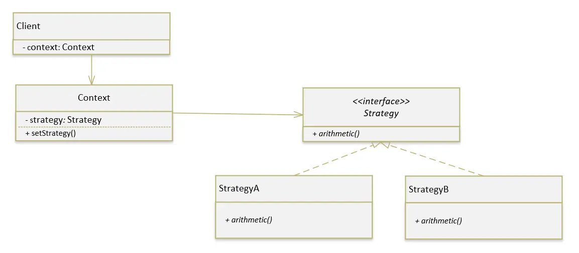 Strategy就是变化的算法簇,这里可以称为为策略,StrategyA、StrategyB就是可以相互替换的算法实现。Context就是拥有这个策略的上下文,策略可以是任何Strategy的实现。