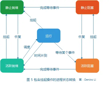 - “静止阻塞” 状态的进程,恢复后,进入“活跃阻塞” 状态。