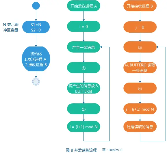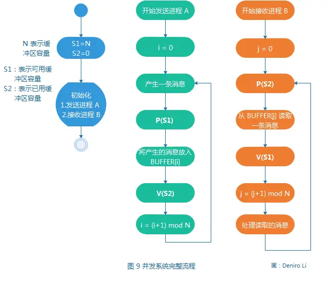 显然,这是一个 “ 生产者 - 消费者 ” 问题,这个问题通常需要 3 个信号量来实现 : 两个用来管理缓冲区同步,信号量 empy 表示空闲缓冲区数量,初值为缓冲区最大数 N ,信号量 full 表示已填充缓冲区数量,初值为 0; 第三个信号量用于管理互斥,由信号量 mutex 保证只有一个进程在写缓冲区,初值为 1。 但在本系统中,进程 A 和进程 B 允许并发地访问缓冲区,因此无须管理互斥,因此只需定义两个信号量 : S 1和 S2 ,初值为 N 的 S1 在此承担的是信号量 empty 的功能,初值为 0 的 S2 则承担了信号量 full 的功能。