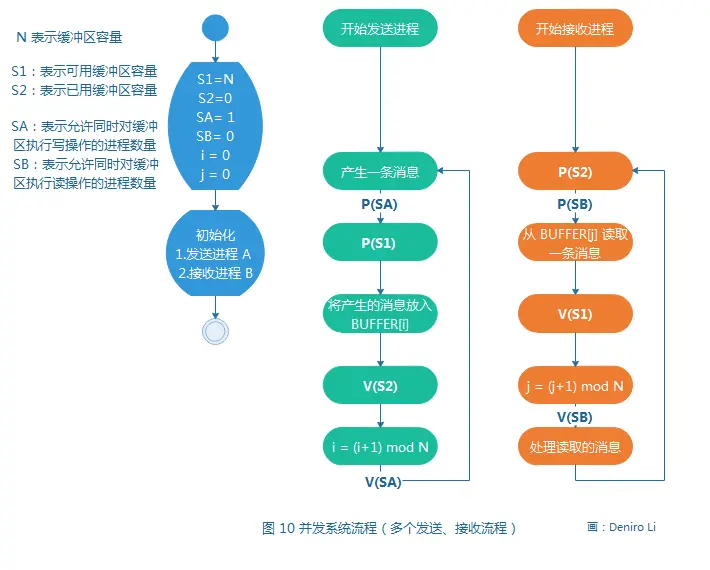 在这套并发系统的基础上,如果系统中有多个发送进程和接收进程,进程间的工作流程如图 10 所示。发送进程产生消息并顺序地写入环形缓冲区 BUFFER,接收者进程顺序地从 BUFFER中取消息,且每条消息只能读取一次为了保证进程间的正确通信,增加了信息量 SA 和 SB 。请说明信息量 SA 和 SB 的物理意义,并把信息量 SA 和 SB 正确应用到流程中。