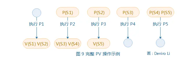 - 进程结束后,必须执行对前趋图中的出口信号量,执行 V 操作,给后一个进程的执行创建条件。比如进程 P1 执行后,它的出口有两条线,信号量分别为 S1 与 S2,那么就需要对这两个信号量都执行 V 操作。