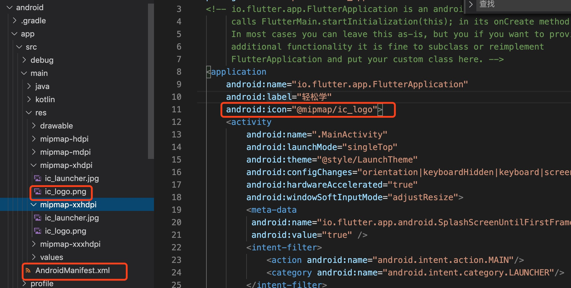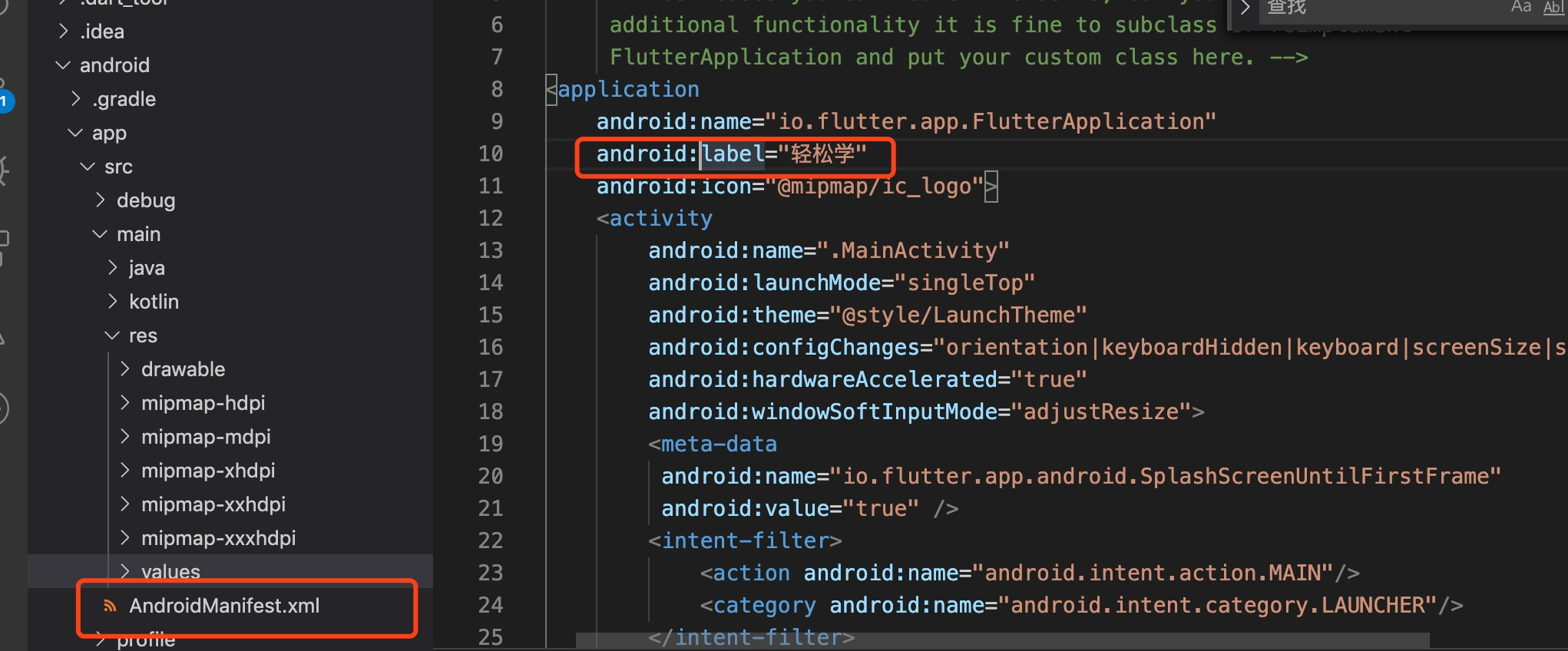 在android/app/src/main/AndroidManifest.xml中修改application中的android:label为"轻松学"