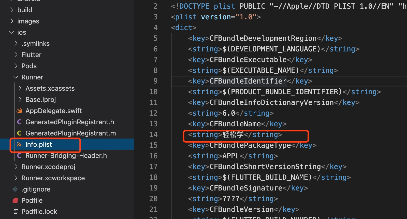 在ios/Runner/Info.plist中修改dict标签中key为CFBundleName下的string标签内容为"轻松学"