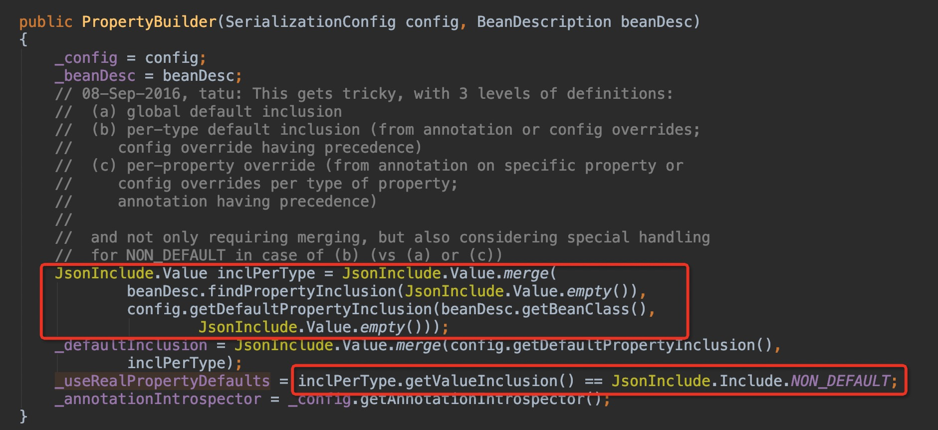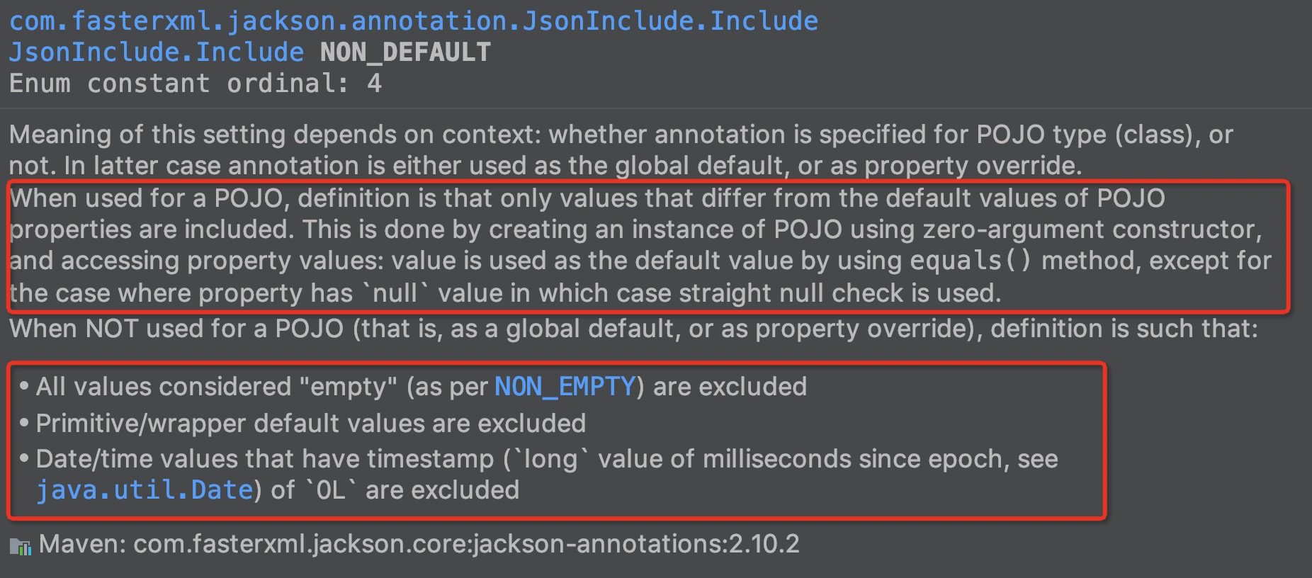 - 当在 POJO 的类上定义时,行为就是通常理解的 NON_DEFAULT