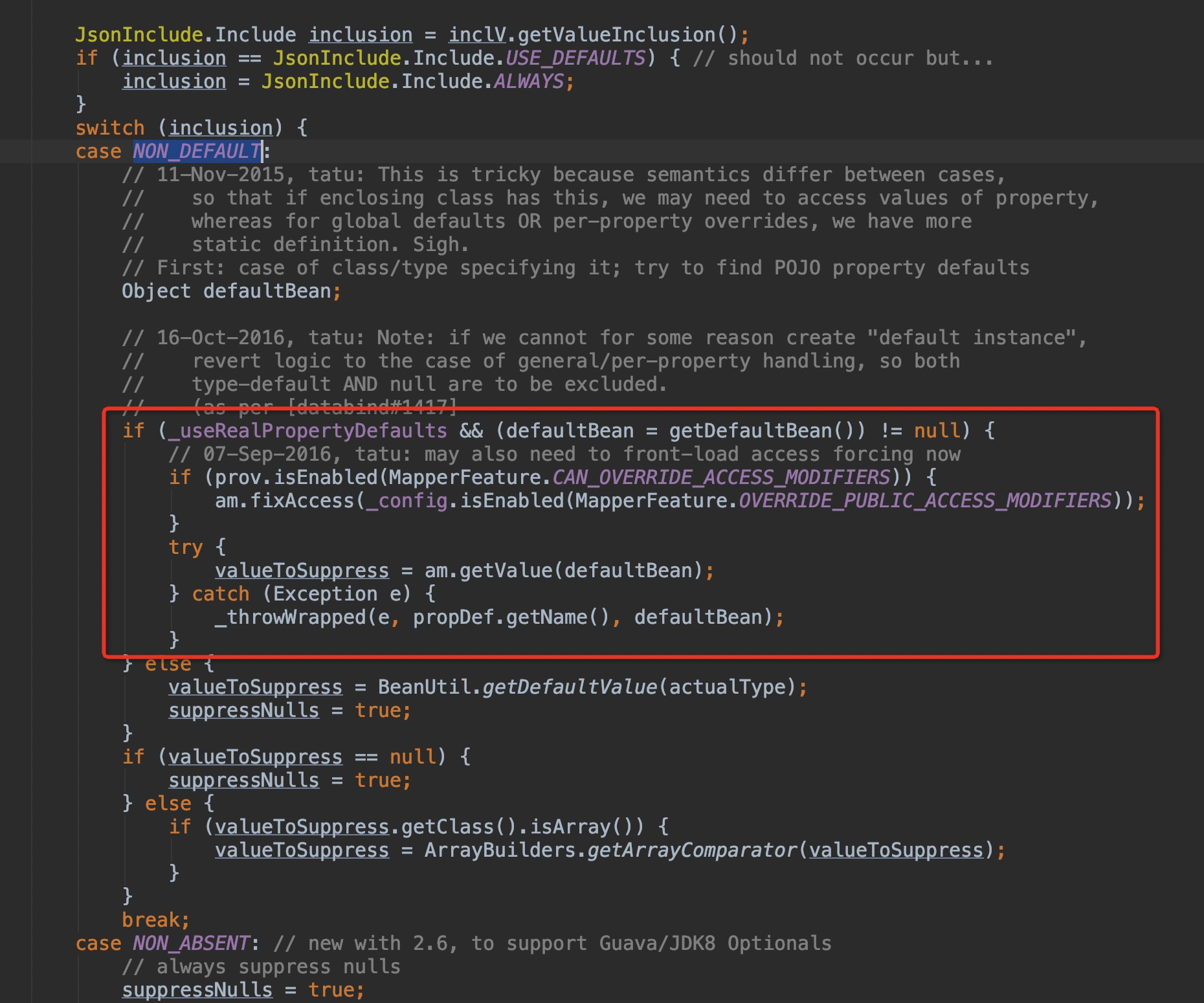 com.fasterxml.jackson.databind.ser.BeanPropertyWriter#serializeAsField 中,我们可以看到 Jackson 在序列化字段时,会将当前值和_suppressableValue进行比较,如果一样即不输出。
