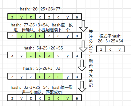 对主串n-m+1个子串分别hash,逐个与模式串hash值进行比较,若相同则匹配成功