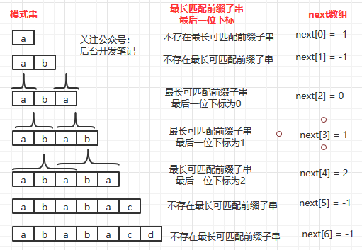 这样我们只需预处理模式串(因为好前缀一定是模式串的前缀子串),我们预处理next数组来保存最长可匹配前缀子串结尾下标,如图: