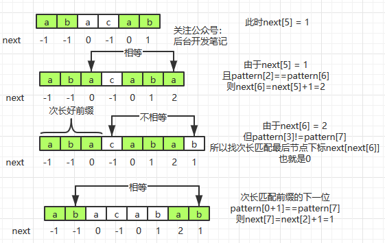 其核心就是利用前面计算出的next[i-1]、next[i-2]...来快速推导next[i],其推导规则为: