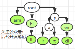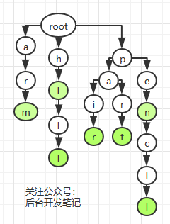 上面的BF、RK、BM、KMP算法为单模式串匹配算法,适用于在一个主串中一次查找一个模式串;而接下来讲的字典树则是多模式匹配算法,可以在一个主串中同时查找多个模式串。假设我们想要在一串字符中查找是否存在arm、hi、hill、pair、part、pen、pencil,就可以用这几个单词来构建一颗字典树: