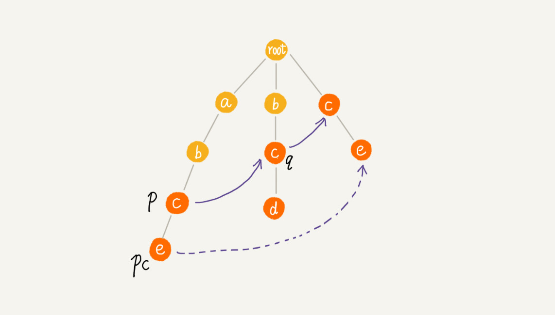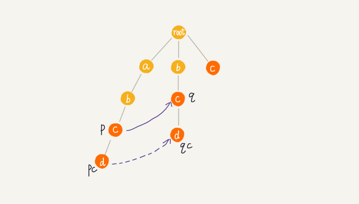 (1) 若节点p的失败指针指向q,q存在和pc字符相同的子节点qc,则pc指向qc