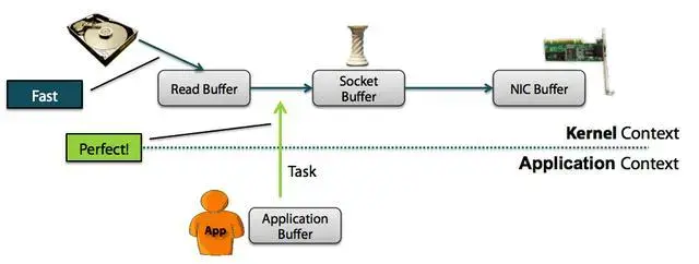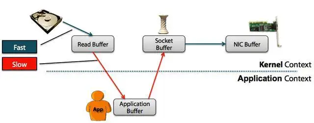 从WIKI的定义中,我们看到“零拷贝”是指计算机操作的过程中,CPU不需要为数据在内存之间的拷贝消耗资源。而它通常是指计算机在网络上发送文件时,不需要将文件内容拷贝到用户空间(User Space)而直接在内核空间(Kernel Space)中传输到网络的方式。