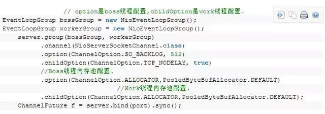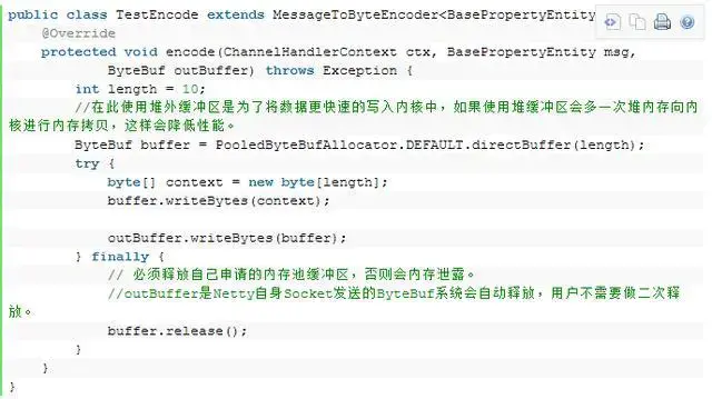 在Netty4或Netty5中实现了一个新的ByteBuf内存池,它是一个纯Java版本的 jemalloc (Facebook也在用)。现在,Netty不会再因为用零填充缓冲区而浪费内存带宽了。 不过,由于它不依赖于GC,开发人员需要小心内存泄漏。如果忘记在处理程序中释放缓冲区,那么内存使用率会无限地增长。 Netty默认不使用内存池,需要在创建客户端或者服务端的时候在引导辅助类中进行配置: