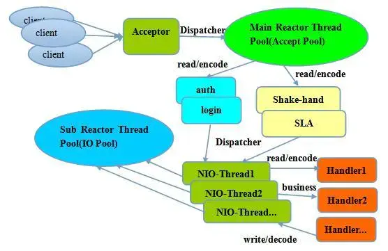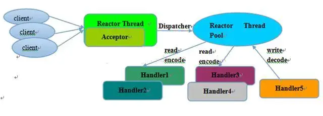 一个线程(单线程)来处理CONNECT事件(Acceptor),一个线程池(多线程)来处理read,一个线程池(多线程)来处理write,那么从Reactor Thread到handler都是异步的,从而IO操作也多线程化。