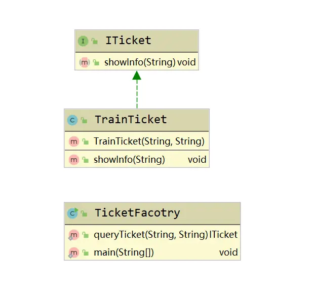 比如要求通过出发站,目的站查询火车票的相关信息,只需要构建火车票对象,然后提供一个查询出发站、目的站的接口给客户进行查询即可,首先创建一个ITicket接口: