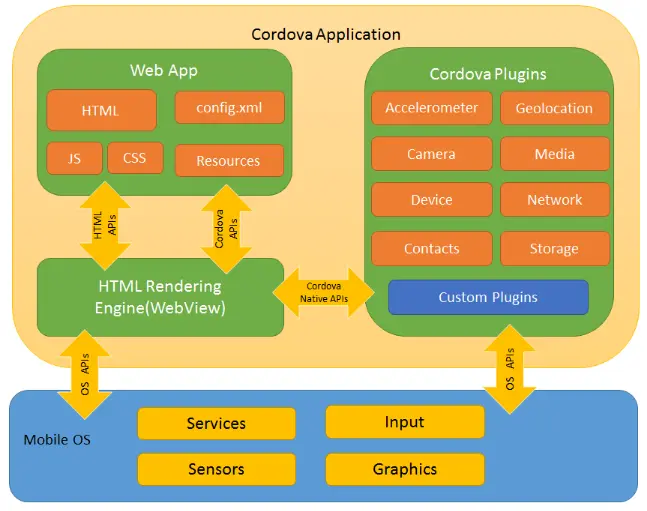 整个cordova包含三部分:web app、webview和plugins。 其中web app是可以自己开发的web代码,webview是针对每个平台开发的浏览器引擎,plugins是cordova针对手机硬件(如相机、电池、存储等)解耦出来的插件组合。