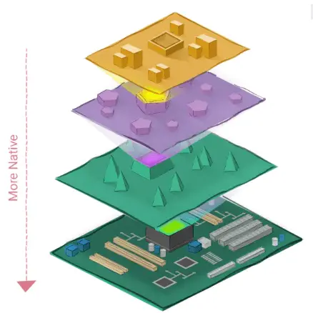 Cordova这样的框架可以使用Web技术来开发移动UI,是因为它们在每个应用中都内嵌了Web浏览器,包括按钮、菜单和动画,都是在浏览器的网页中运行的。Cordova应用的UI就是运行在Web浏览器中的模拟世界,而浏览器又是运行在原生框架里的另一个模拟世界。