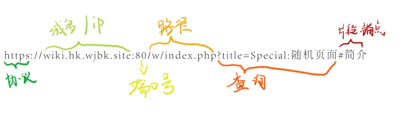URL由协议、域名或ip、端口号、路径、查询参数、锚点组成。详见下图: