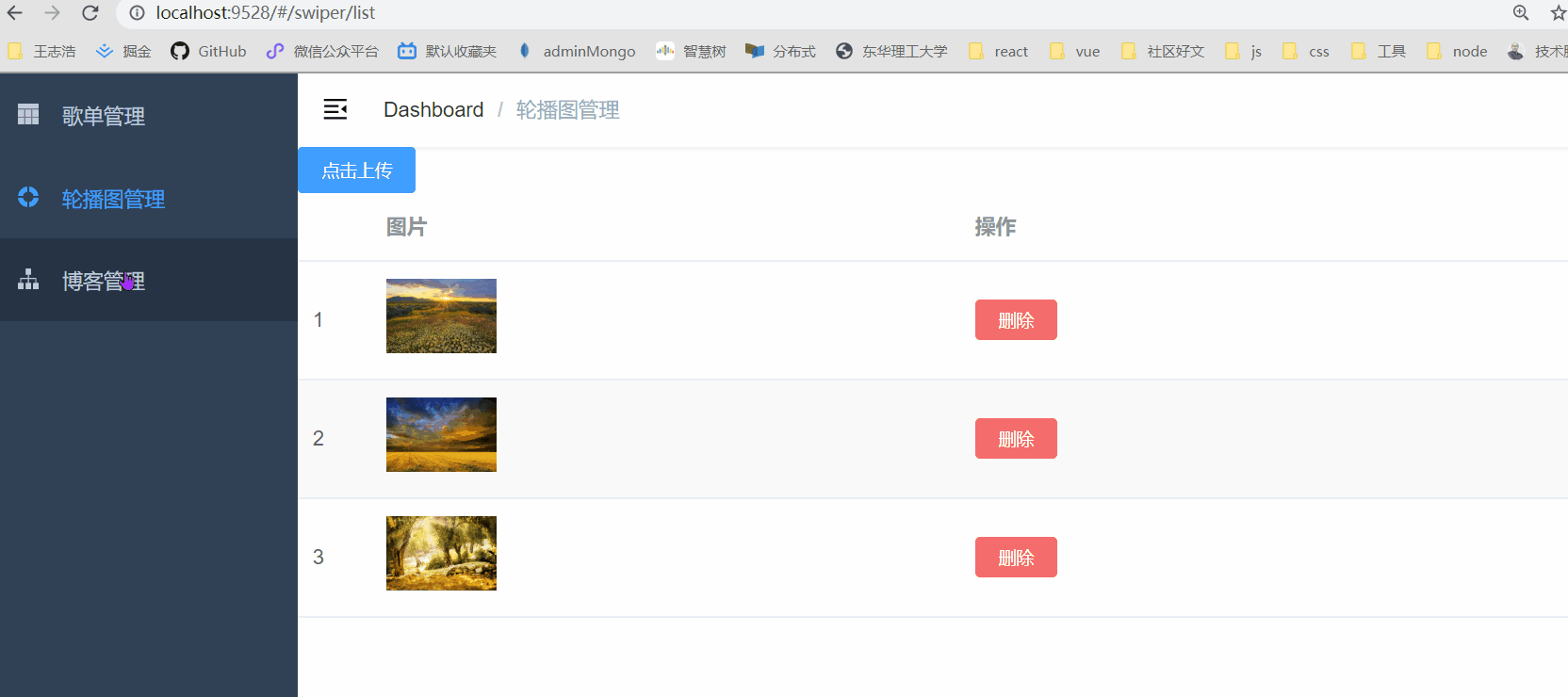 views目录下建立了三个文件夹playlist、swiper、blog,分别代表上文gif图中显示的歌单管理、轮播图管理、博客管理三个页面的视图文件。(当然,你必须根据自己的小程序来设计。) - 2、在