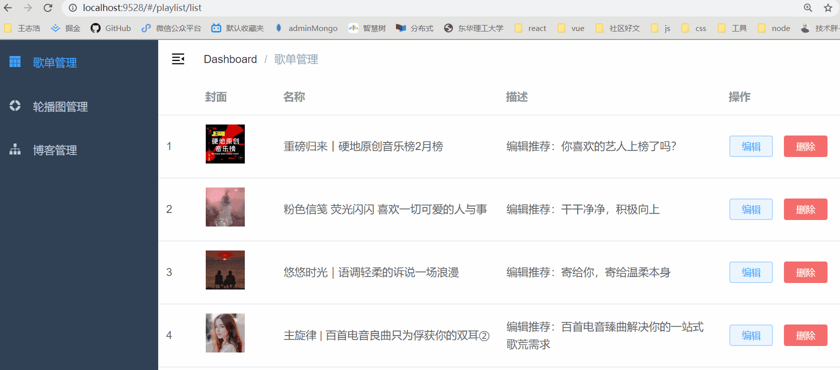 fetchList方法用于歌单的获取、del方法用于歌单的删除。代码不长,我就把playlist.js中这两个方法直接贴出来了。如下:(baseURL为后端项目开启的地址,request方法是模板项目封装好的axios请求方法)