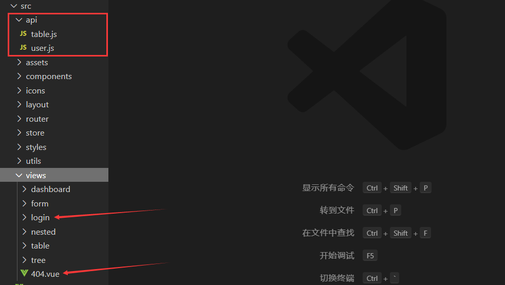 views目录下只留下login文件夹和404.vue,其它全部删除。然后根据自己的小程序中需要管理的数据设计好需要哪些前台页面,根据自己的需求建好项目的视图文件。 -