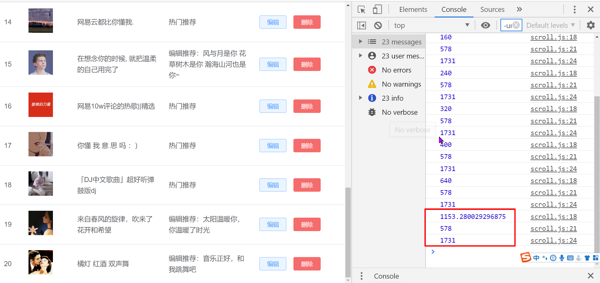 - 最后我才想到这个点上来,会不会是这个有问题。对这三个数据分别打印出来如上图,红框中就是浏览器滑到底部打印出来的数据,我哭了🤪🤪