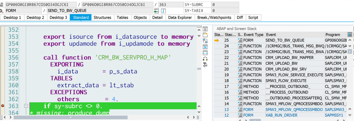 check this structure: BAD_BUS_TRANSN_MESSAGE and this FM: /1CRMGC/BUS_TRANS_MSG_BWA ( constant of site id defined there ) table SMOXSTAT: defintion for all data sources table SMOXRELP_S: definition of fields for datasource... important mapper: CRM_BW_SERVPRO_H_MAP This mapper is called before data is sent to BW.