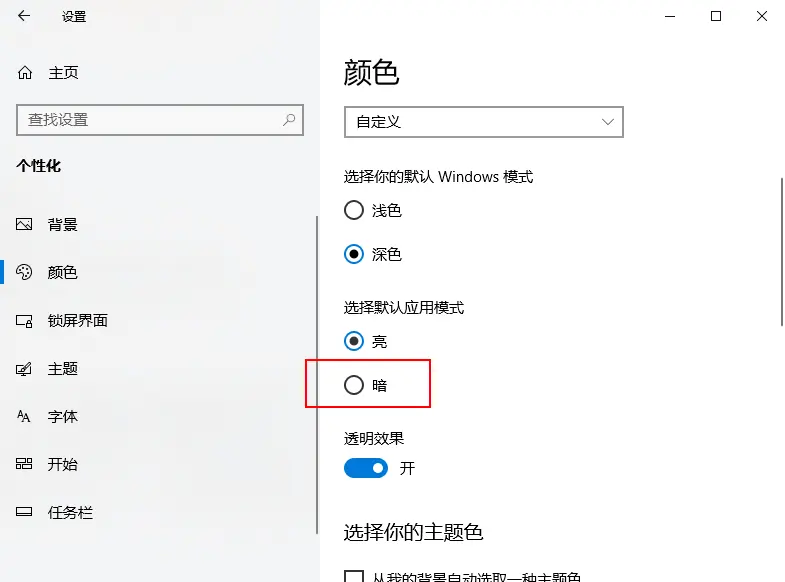 这里以 windows 10 为例,我们只需在 开始-设置-个性化-颜色-选择默认应用模式(暗)