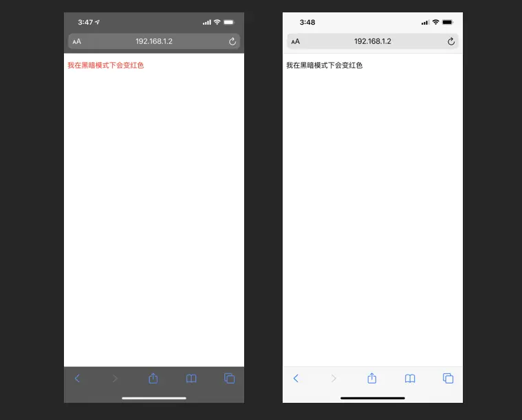 我们以 iPhone 为例,代码不变,只需在 设置-显示与亮度 开启黑暗模式即可,效果如图: