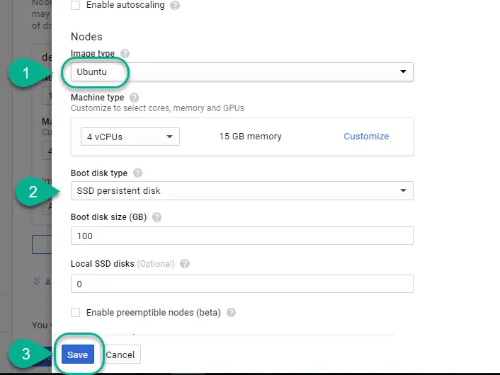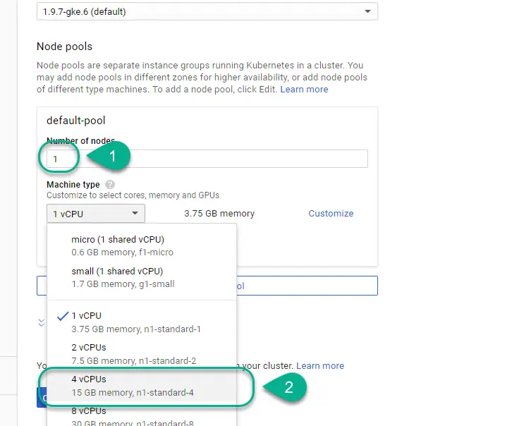 该集群的node个数选择为1,从Machine type下拉列表里选择CPU配置: