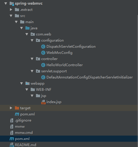 在这里不阐述是如何实现自动装配Spring MVC项目的,后面会有单独的介绍,先简单给出代码让我们的程序跑起来,方便一步一步Debugger。