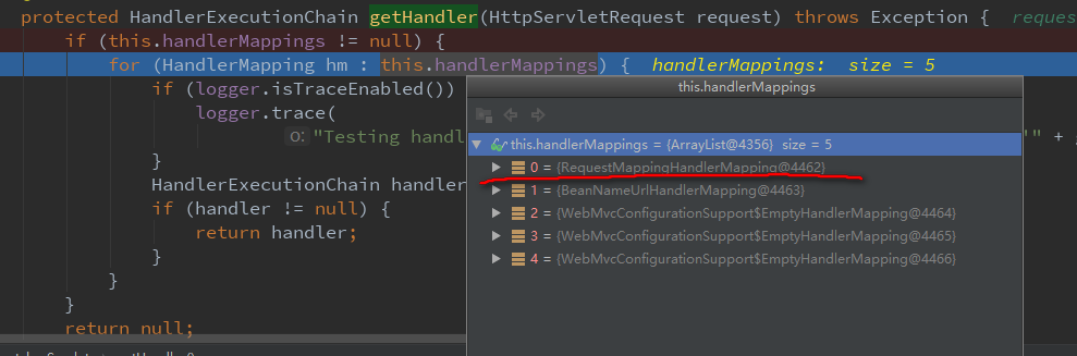 接着往下看,通过RequestMappingHandlerMapping 获取当前请求的处理程序执行链也就是 HandlerExecutionChain 包含当前处理程序对象和任何处理程序拦截器。