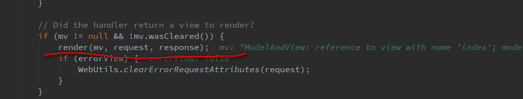 使用给定的适配处理程序来处理此请求,返回ModelAndView对象,这里viewName是 “index”,我们可以对应刚刚我们写的HelloWorldController#index()方法,确实方法返回的就是"index" 字符串。