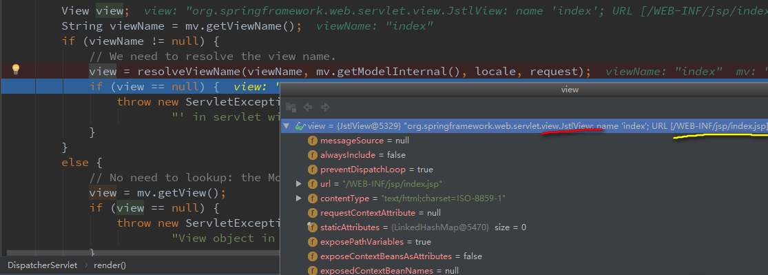 最后通过render方法来渲染视图,我们在进入render方法中看一下就可以查找到我们想要的org.springframework.web.servlet.view.JstlView 和对应返回的资源URL。