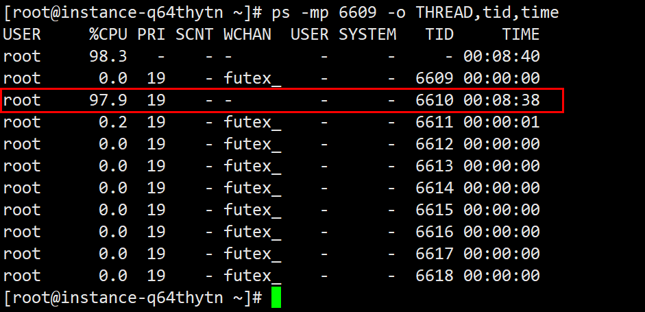 可以看到 6610 这个线程 ID 对应的线程 CPU 使用占比最高,并且占用 CPU 时间也最长