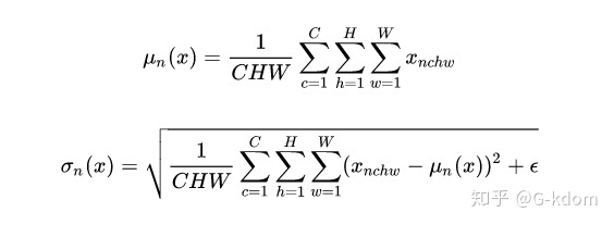 对于,IN 对每个样本的 H、W 维度的数据求均值和标准差,保留 N 、C 维度,也就是说,它只在 channel 内部求均值和标准差,其公式如下: