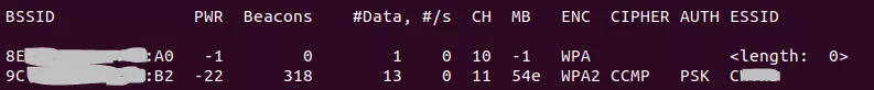 但是如果你隐藏了wifi,那么只是相当于把这些信号里的wifi名称给隐藏了,而其他信息还是正常发送出去,如上图第一行的wifi,ESSID一栏显示为<length:0>,代表该wifi隐藏了。