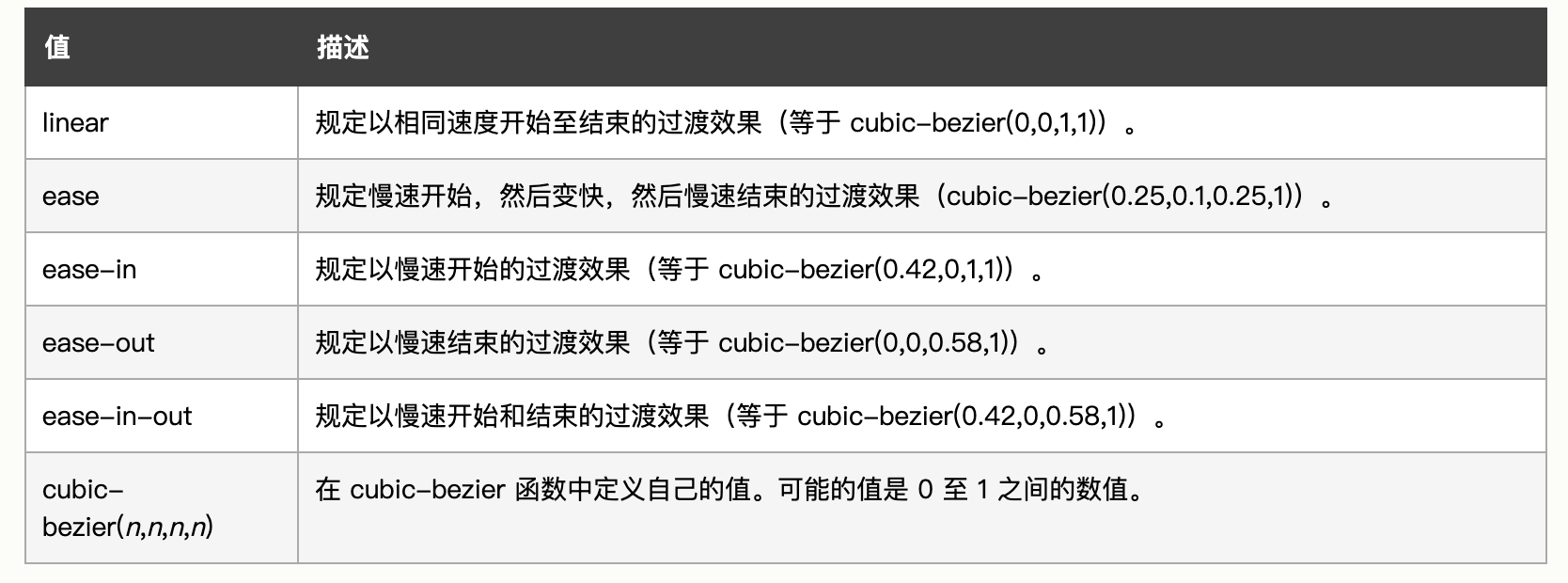 | transition-timing-function | 规定速度效果的速度曲线 |
