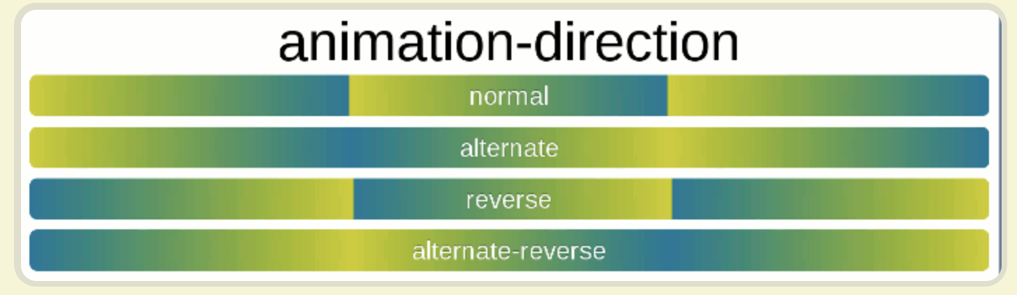 | direction | 设置动画播放方向:(见下图) normal(按时间轴顺序) reverse(时间轴反方向运行) alternate(轮流,即来回往复进行) alternate-reverse(动画先反运行再正方向运行,并持续交替运行) |