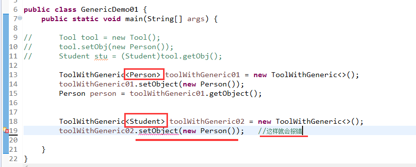 - 提高安全性。下图中的代码,当18行代码中将泛型指定成Student类型的时候,在19行给steXXX的时候传入Person就会报错。