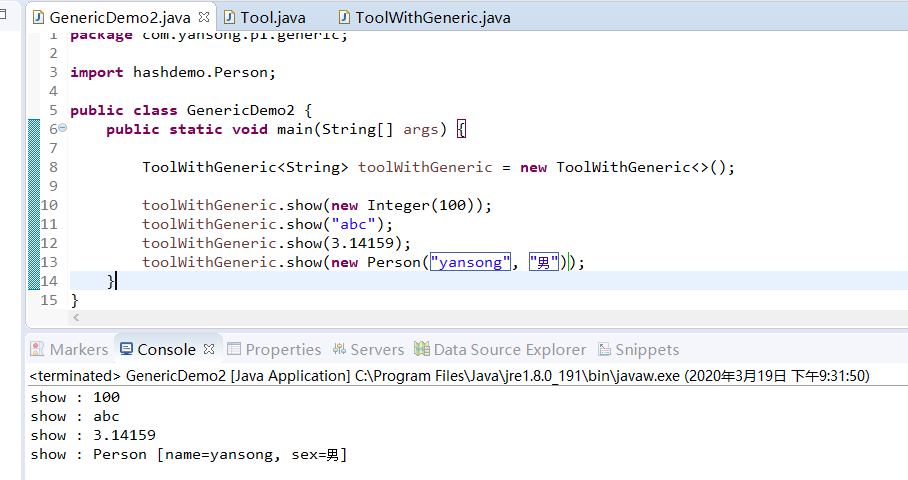 toolWithGeneric.show(new Person("yansong", "男"));