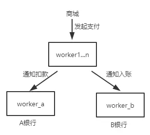 其中A、B银行的业务逻辑和数据都在自己 worker 中,那么在支付行为发生时,会分别给A、B银行发送通知进行扣款或者入账,这就可能会导致某一时刻下,查询用户与商家的余额,出现了不一致的现象。因为可能A银行对用户扣款成功了,但B银行还未完成入账。这种场景下,再怎么优化,也只能保证数据的最终一致性。