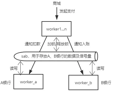 通知A、B银行扣款/入账(可以用信号量进行同步),并在操作成功后通知 worker1