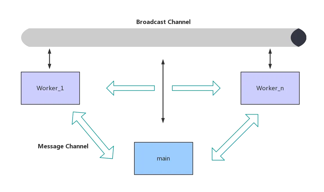 其中 main 是 JavaScript 主线程,而 worker 是基于 Web Workers 创建出来的线程,从图中可以看到,线程间的通信主要通过两种渠道:1、通过 Message Channel 进行线程间的通信;2、通过 Broadcast Channel 进行广播。其中 Web Workers 内部就是用 Message Channel 进行双向通信的,由于 Broadcast 比较简单,本文就略过,主要讲下 Web Workers。