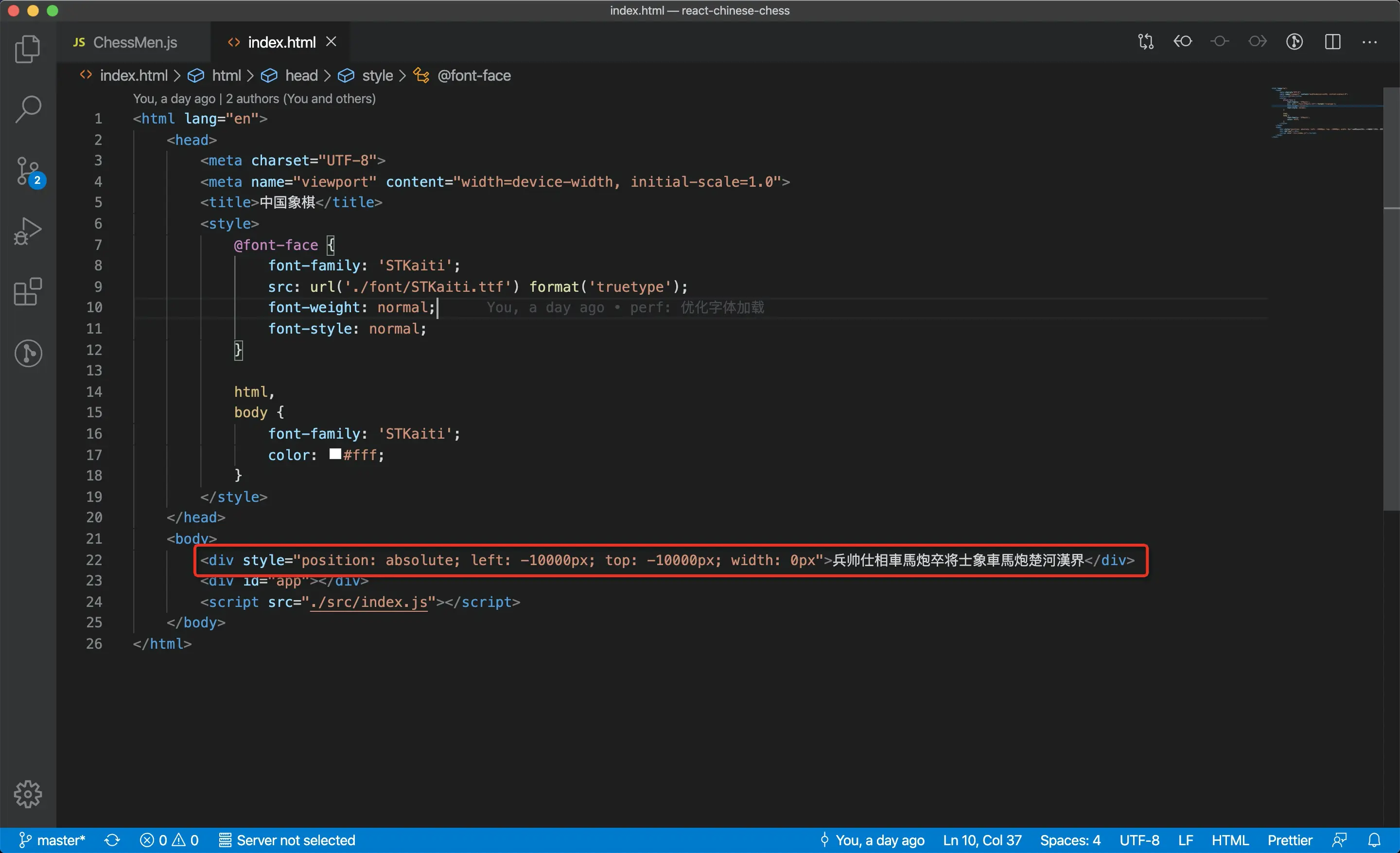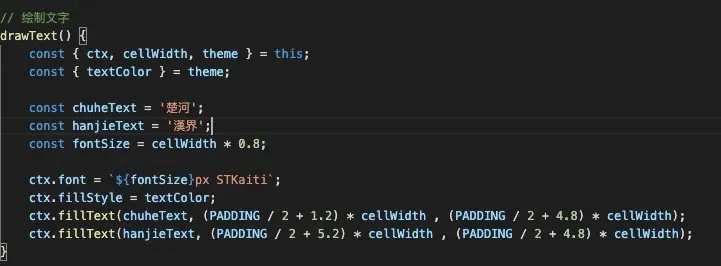 使用 fillText 的 api,增加楚河汉界。为了让字体好看一点,使用了 STKaiti。